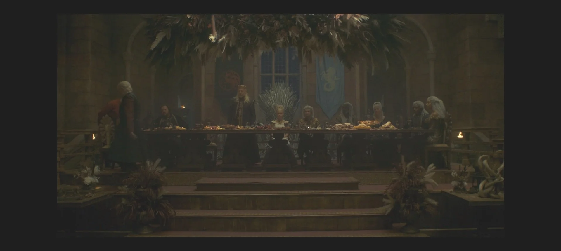 The royal family prepares to welcome Westerosi nobility for the wedding of Rhaenyra and Laenor, but Alicent is scarce. After the Lannisters arrive and a member of House Royce introduces himself out of turn, the Velaryon family makes their grand entrance with a host of attendants including Laenor’s lover, Joffrey Lonmouth. Daemon arrives dramatically and seats himself at the head table, and as King Viserys begins a speech to kick off a week of celebration, Queen Alicent enters alone, in green. Her impact is felt throughout the hall, with ??? remarking on the color of the Hightower’s beacon in times of war matching the dress.