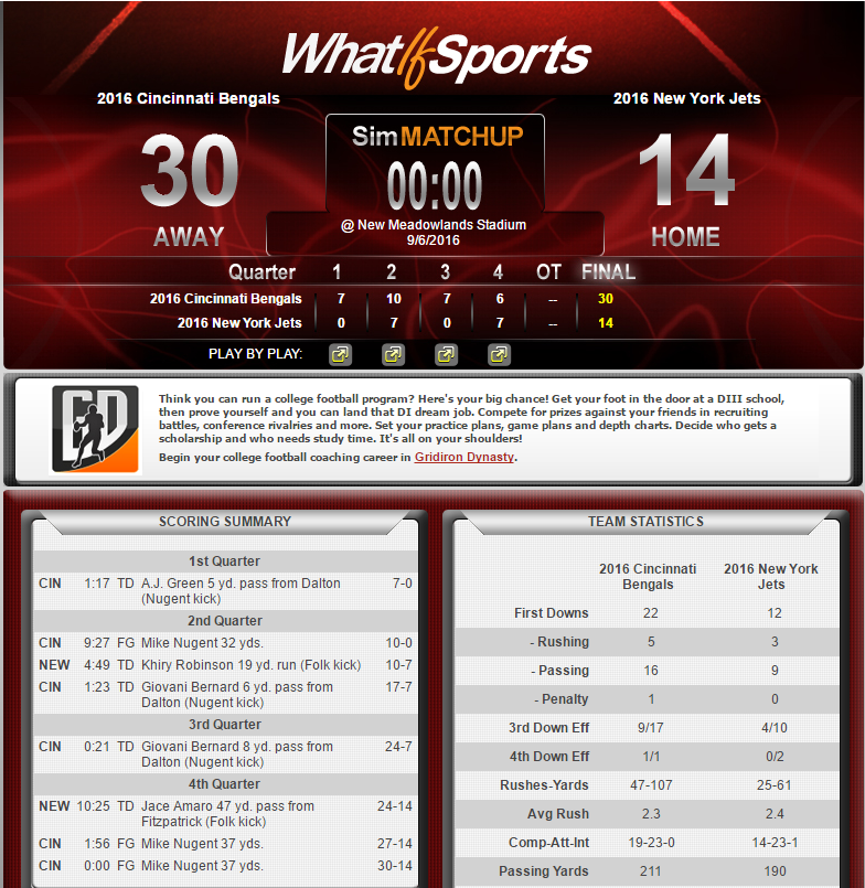 The Jets were a strange team to follow last year. Ryan Fitzpatrick got the interception monkey off his back after ten seasons in the NFL (3.5% INT rate from 2005-2014, 2.9% last year) but they barely missed the playoffs at 10-6. I'm expecting Fitzpatrick to revert to his equal opportunity passing approach and the Bengals to play well enough in all phases to not beat themselves. Like they did last year. In the playoffs. Oops.