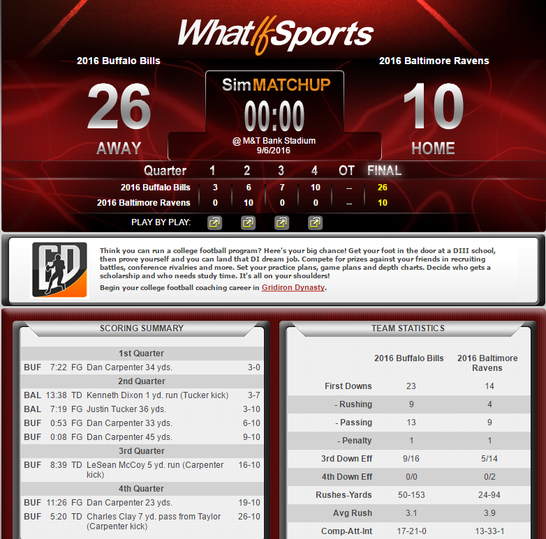 Many of the statistics I'll reference while making my case (particularly DVOA) will be coming from the folks at Football Outsiders who do a great job creating and applying advanced analytics. Another site, WhatIfSports, provides the simulation engine used to generate the winning scoreboards below. Finally, the spreads for each game come from Vegas Insider's Consensus line. A big thank you to all three sources as I embark on my quest for 60%. Let's get to the picks!