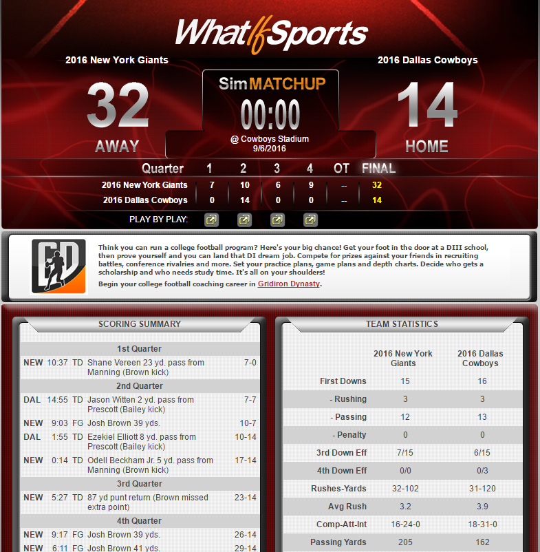 The Giants played their inconsistent brand of football right to a 6-10 record last year. They can be a frustrating team to depend on, but they have a very good quarterback in Eli Manning and one of the best receivers in the game in Odell Beckham Jr. Whether the defense improves as much as envisioned when they shelled out over $80 million of guaranteed money in free agency remains to be seen; either way, it should be enough to handle rookie Dak Prescott in his debut.