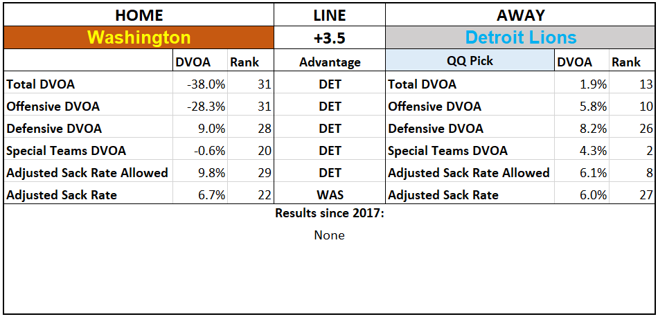 Both teams are disappointing by W-L record, but only Washington has reached the depths of losing to the Jets. A big part of their problem has been the (understandably!) poor play of rookie quarterback Dwayne Haskins, who has two touchdowns and five interceptions across four games this year. Detroit has looked surprisingly competent with Jeff Driskel playing for the injured Matthew Stafford, and they’ll be able to score against Washington’s 28th-ranked defense. Can their own banged-up defense hold up their end of the bargain? If the Giants can hold Washington to 3 points, then yes. Absolutely. Lions -3.5