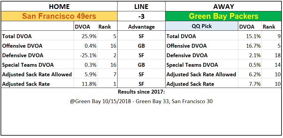 How afraid am I of this version of Aaron Rodgers? Most signs point to picking the Niners here, with an elite pass rush capable of pressuring Rodgers and getting him off his spot. If they’re disciplined enough to keep him in the pocket, it would make for a statement game at the top of the NFC rankings. Of course if they can’t, it will be up to Jimmy Garoppolo, whose best performances of the year have come against the Cardinals (twice), the Bengals, and the Panthers. Green Bay’s defense doesn’t exactly drip with swagger, but they’ll do enough to keep this game close. And when the game is close…Rodgers drinks your milkshake. Packers +3