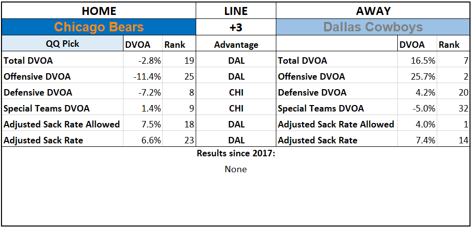 One of the benefits of extra time to dig into these lines is looking through each team’s results throughout the season. At first, seeing the Cowboys and their top-ranked offense favored by only 3 points over Mitchell Trubisky seemed crazy, but looking at the Cowboys’ losses this year made a different case. Three of Dallas’s losses came against a Teddy Bridgewater-led Saints team, the New York Jets, and the Buffalo Bills. Those teams all have a similar profile to Chicago’s rankings of 8th on defense and 25th on offense, so we took the home underdog and a field goal of help. Bears +3