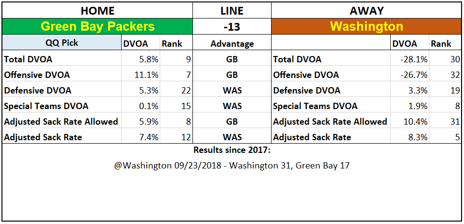 I know Washington has somehow found two wins against the Lions and the Panthers, but those teams have deep-seated issues all over the place. The Packers had their doors blown off by the 49ers a couple of weeks ago, but they bounced back with an 18-point win over the Giants last week. Washington won’t put up much more of a fight this week, and this one will be over early. Packers -13