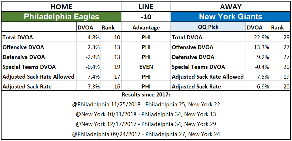 The Giants are going back to Eli Manning this week. What that means for the New York offense is an utter mystery, but it’s hard to imagine him performing worse than Daniel Jones in his return. If Philadelphia can give up 37 to Ryan Fitzpatrick, I’d expect the Giants to manage something on offense, which should be enough to cover 10 points against an Eagles team averaging 19 points per game since Week 6. I don’t recommend anyone actually watch this disaster-that-somehow-has-NFC-East-implications, but don’t be surprised if it looks even weirder than it sounds. Giants +10
