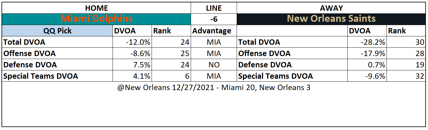 How bad do we think the Dolphins are? The 24th-ranked team by DVOA being favored by six seems outlandish, but New Orleans is decidedly worse at 30th and have largely been trending downward. Of course Miami could blow this game, but they’re a tougher opponent for Tyler Shough than the Panthers were and they’re coming off a bye. Let’s get crazy. Dolphins -6