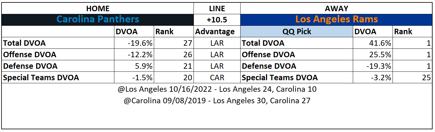 This game can go one of two ways. In the first, Carolina goes home after two straight road games and puts up a solid fight against the league’s best team by DVOA. They’ve played some decent defense at home, and when they’ve been able to run the ball they’ve scored points against even competent defenses. The second way it goes is a reminder from the Rams to the rest of the league that they really are the top team, and top teams don’t mess around with inferior opponents. One of Carolina’s big home losses this year was to the Bills, who went into Carolina and won 40-9. I think the Rams are an even better team than Buffalo, and their defense is going to make life miserable for Bryce Young. This line should probably be 14. Rams -10.5